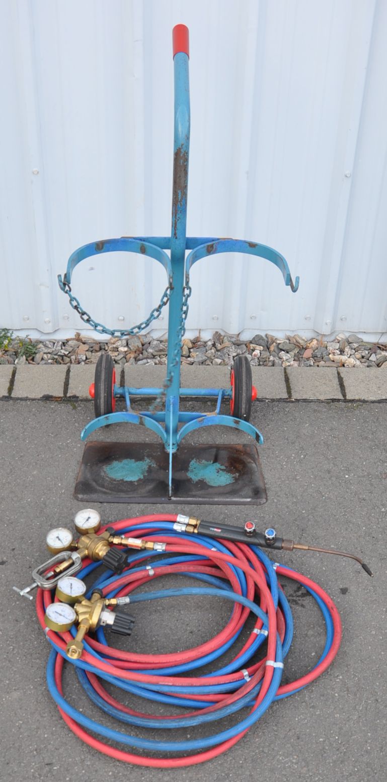 Sie kaufen einen technisch voll funktionstüchtigen gebrauchten Autogen Flaschenwagen mit Autogen-Schweißschlauch und Schneidbrenner mit Einsatz.Artikelmerkmale